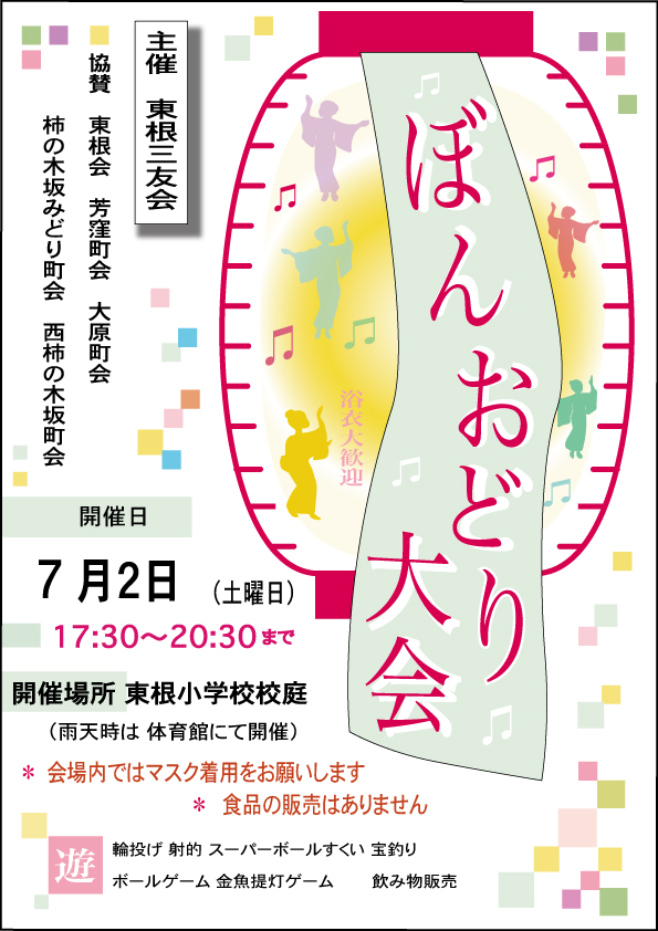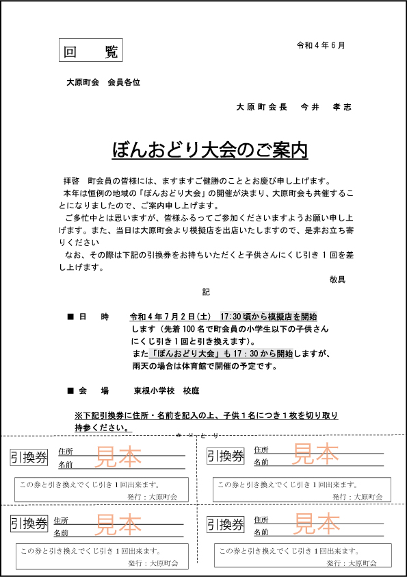 ぼんおどり大会につきましては回覧板に小学生以下のお子様にくじ引き引換券をご用意しています。