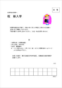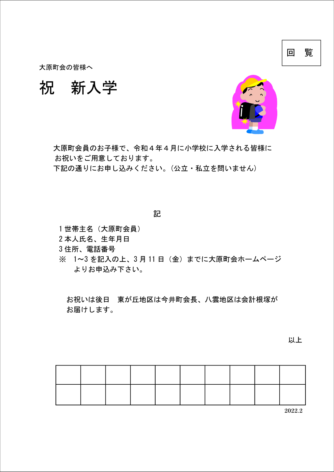 大原町会員のお子様で、令和4年4月に小学校に入学される皆様にお祝いをご用意しております。