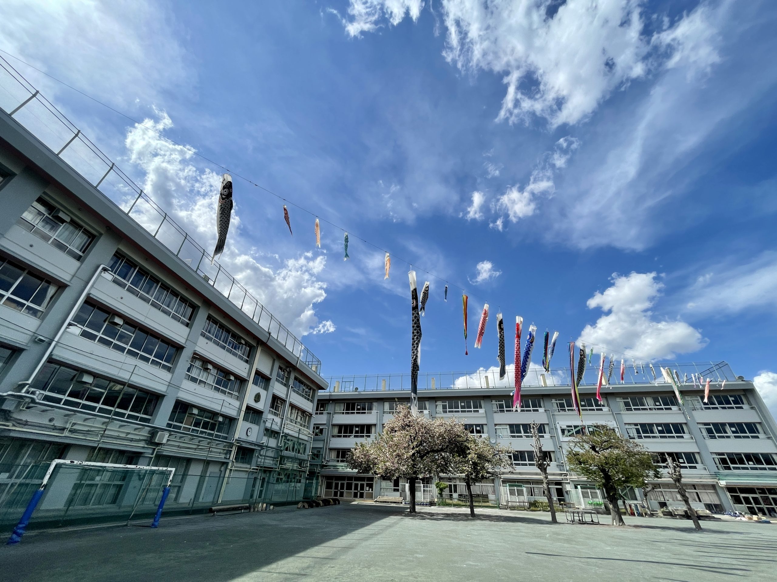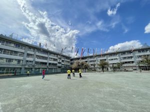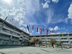 鯉のぼりは5月13日まで、子ども達の健やかな成長を願い校庭の空を元気に泳ぎます。
